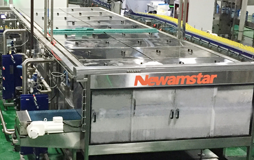 由于碳酸饮料采用低温灌装(常用4-10℃),而夏季的室温远高于此,在这样的环境中 ,空气中的水分极易在瓶身外表面冷凝结露,给后续包装和操作带来不便,如贴标。特别是如果采用纸箱包装,则露水浸湿纸板,可造成严重破损。所以在灌装机后必须设置一台温瓶机,对瓶身加热至室温。温瓶机是一台隧道式喷淋设备,通过循环喷淋热水的热交换方式加热瓶身,常设三个温区(也可设计更多的温区)。分段加热后,饮料中心的温度达到室温。温瓶机的进出口采用动态过渡,减少挤压倒瓶及人工干预。